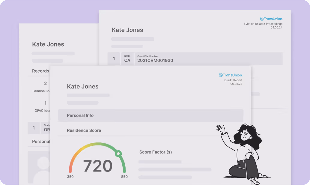 Credit report, background check, and eviction history are provided by TransUnion. These reports are subject to laws and regulations that are subject to laws and regulations that may limit information reported, screening fee amount, and when criminal and eviction reports are released. Learn more about TransUnion’s criminal background check and screening restrictions.